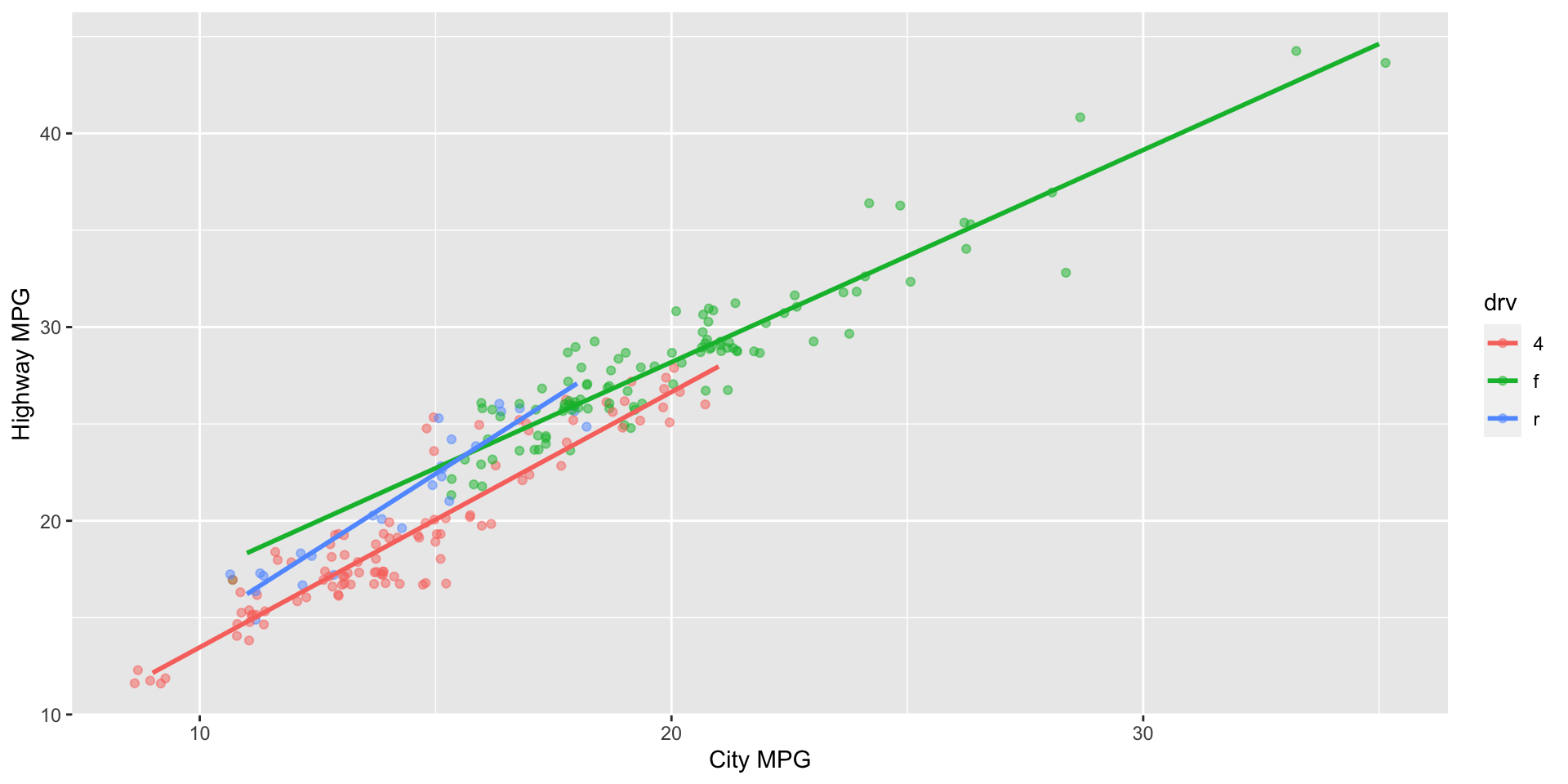 Provide a 1-2 sentence interpretation of the relationship between city and highway mileage of cars, taking into consideration whether they’re 4 wheel drive, front wheel drive, or rear wheel drive.