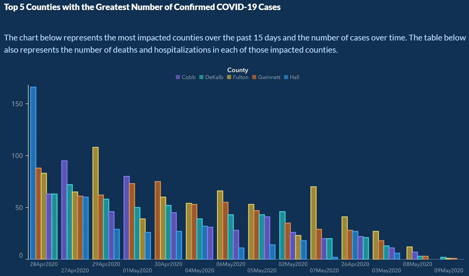 In May 2020, the state of Georgia published the following visualization. What does this plot say about the number of COVID cases in the most impacted counties?