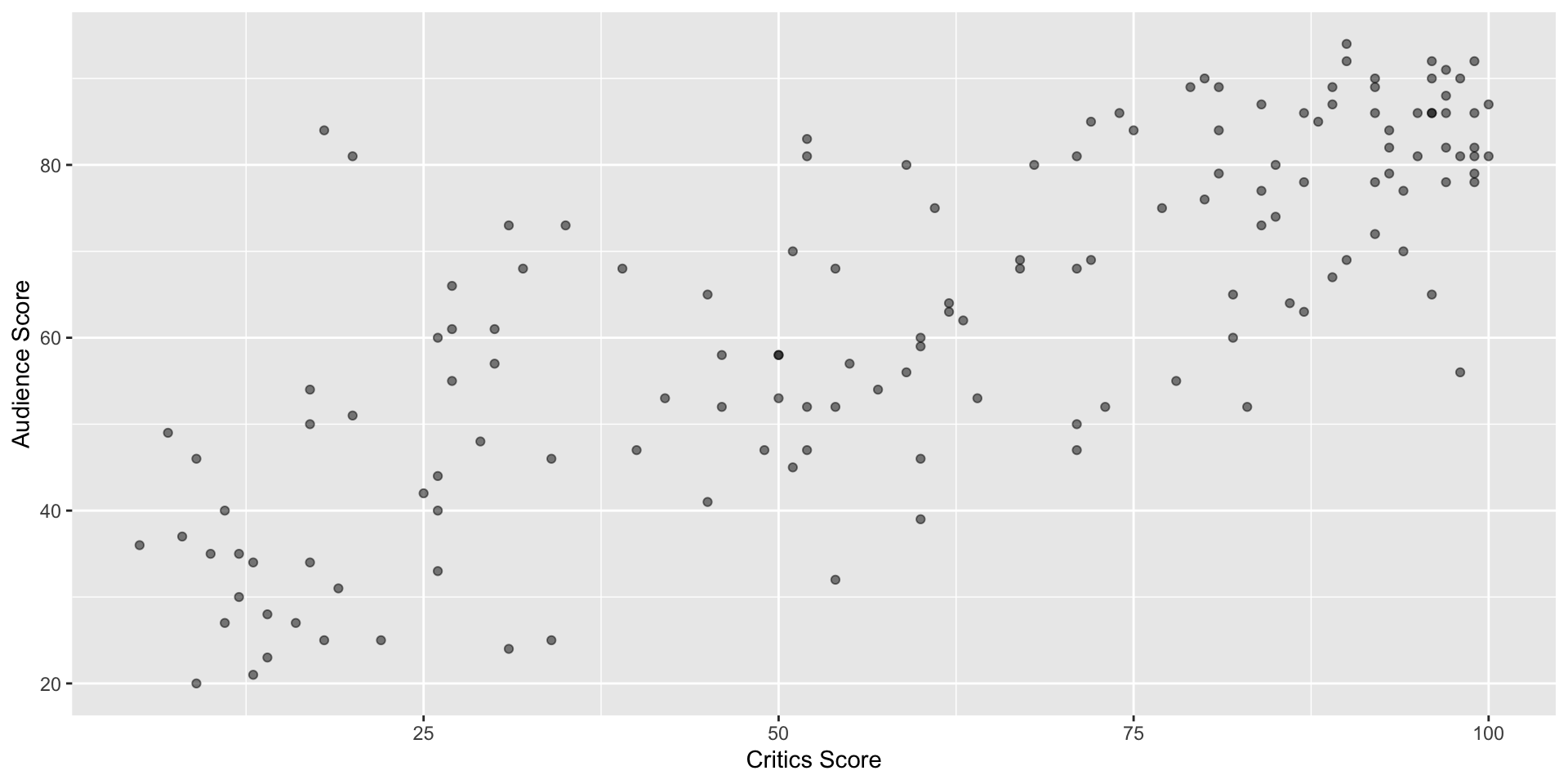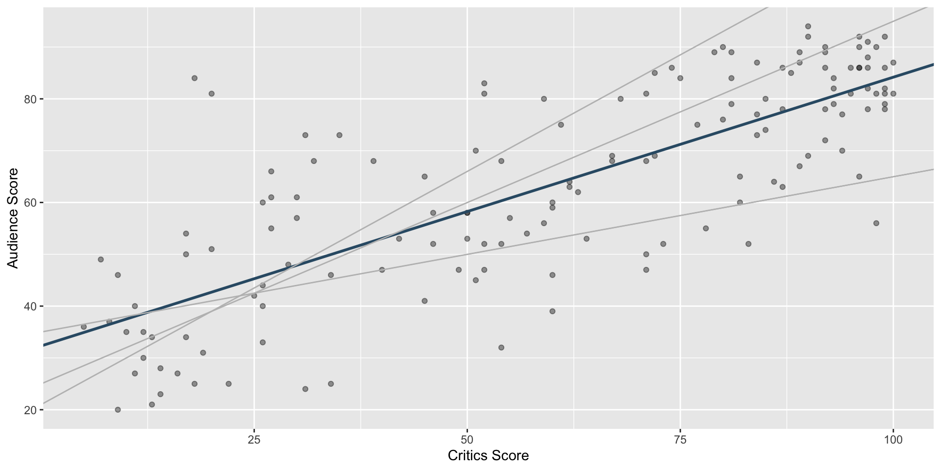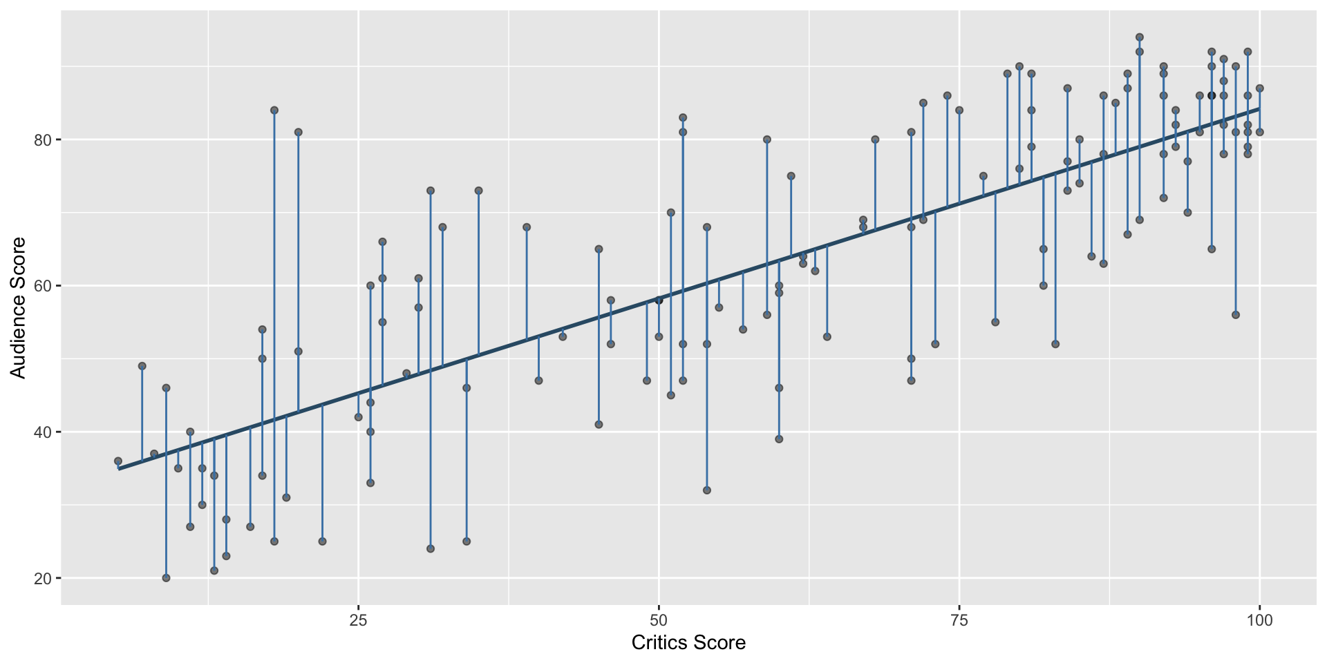 critics and audiencemovie_scoresA regression model is a function that describes the relationship between the outcome, \(Y\), and the predictor, \(X\).